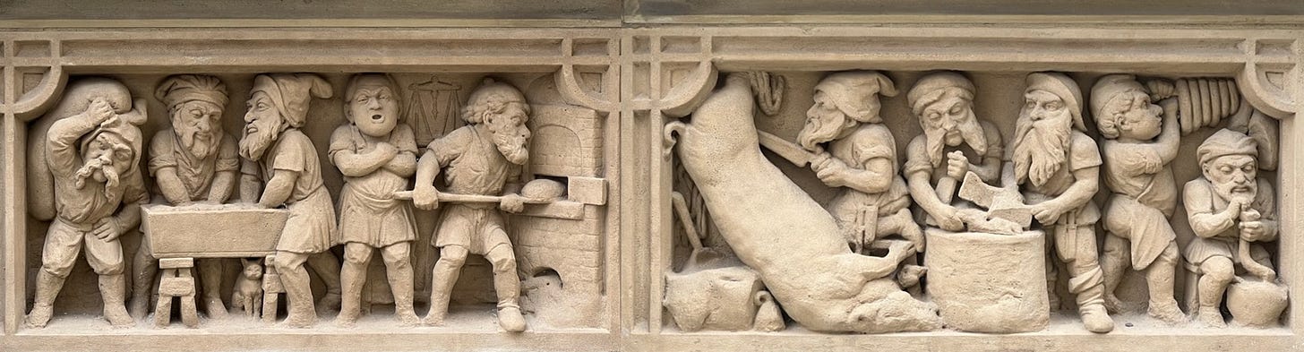 A long, long time ago, in the homes of Cologne's residents, there lived a group of little elves (Heinzelmännchen). They would secretly assist people at night in completing tasks left unfinished. These little elves gladly helped carpenters build houses, bakers bake fresh bread, butchers fill sausages, brewers craft fine wines, and tailors sew new clothes. They preferred not to be seen, so they always worked while everyone was asleep at night. The presence of these little elves relieved people of the worry of unfinished work, allowing them to sleep peacefully every night.